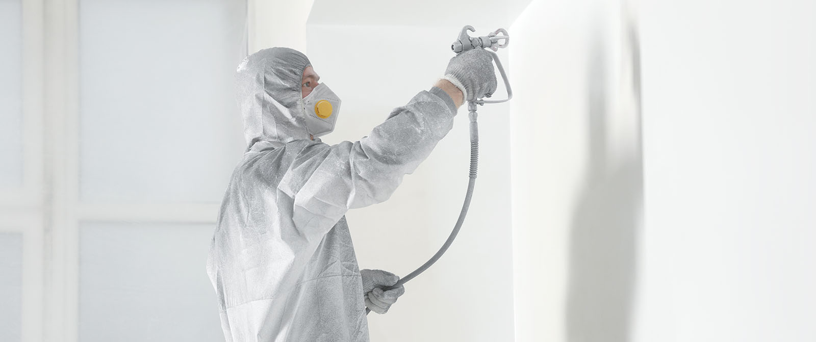 Als voorbereiding beschermen we eerst alle oppervlakken die niet geschilderd worden met folie en tape. Vervolgens controleren we de ondergrond en voeren indien nodig kleine reparaties uit. Daarna wordt met het airless spuitsysteem de verf in een dunne, egale laag op de wanden en/of plafonds aangebracht. Indien nodig brengen we meerdere lagen aan voor een perfect dekkend resultaat.